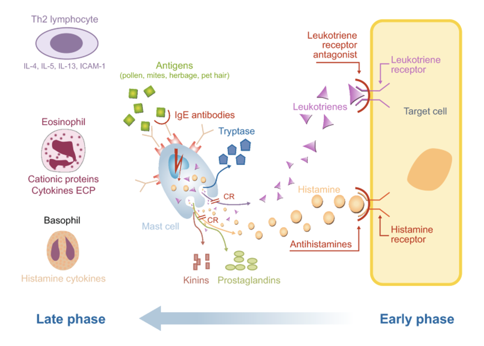 Fig. 1 Early and late phases showing the pathophysiological processes and drivers of allergic rhinitis and the potential sites for pharmacological intervention. ECP eosinophil cationic protein, ICAM-1 intercellular adhesion molecule-1, IgE immunoglobulin E, IL interleukin